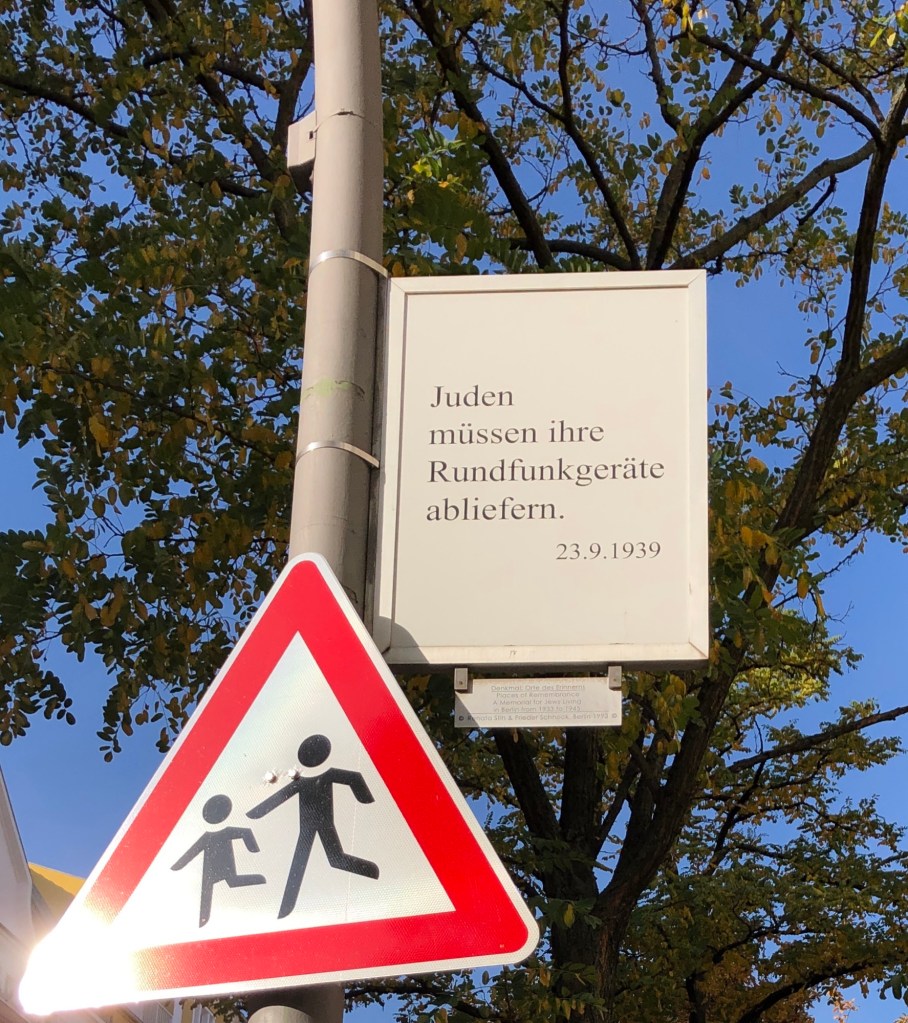 Im Berliner Ortsteil Schönefeld lebten Anfang der 1930er Jahre über 16.000 jüdische Menschen im Bayerischen Viertel, unter ihnen Kurt Tucholsky, Erich Fromm und Else Lasker-Schüler. Lediglich 171 von ihnen überlebten die 12 Jahre der Naziherrschaft mit Entrechtung, Verfolgung und Deportation. Heute befindet sich hier das Flächendenkmal „Orte des Erinnerns im Bayerischen Viertel: Ausgrenzung und Entrechtung, Vertreibung und Ermordung von Berliner Juden in den Jahren 1933 bis 1945″. Auf insgesamt 80 doppelseitig gestalteten Schildern mit je einer Bild- und einer Textseite wird den Betrachterinnen und Betrachtern exemplarisch vor Augen geführt, wie die Nationalsozialisten den in Deutschland lebenden Jüdinnen und Juden mit einer schier unglaublichen Zahl an Gesetzten und Verordnungen nach und nach ihre Rechte entzogen.